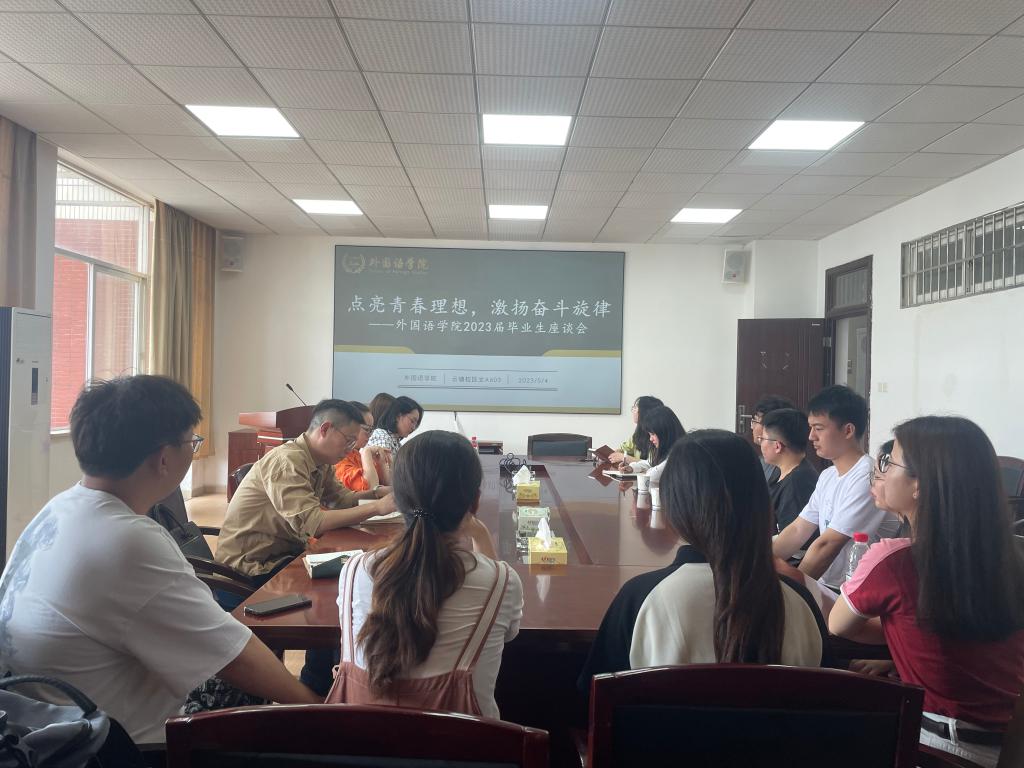 2023年5月4日上午10:30,我院于云塘校区文科楼A603召开外国语学院2023届毕业生座谈会,学院党委书记文丽丽、院长段胜峰、院党委副书记周芳、副院长季红琴、学工办主任武巧琳、毕业班辅导员龙洋出席座谈会,学院19级毕业生代表10人,20级学生代表5人参加此次座谈会。