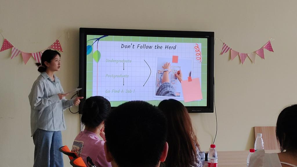 被英国威斯敏斯特大学录取的杨蕙祯主要为在座学生分享海外院校申请经验各类细节、应试技巧干货满满。同时她表示无论选择考研、就业或是出国留学都是可以纳入职业规划当中追求自身个性化发展。