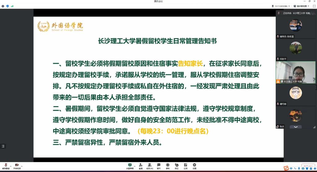 毛婕就《开云kaiyun体育暑假留校学生日常管理告知书》进行相关解读。武巧琳、陈若晨分别从本科生、研究生暑期留校相关规定进行强调。