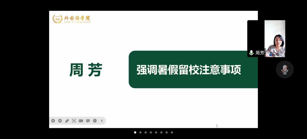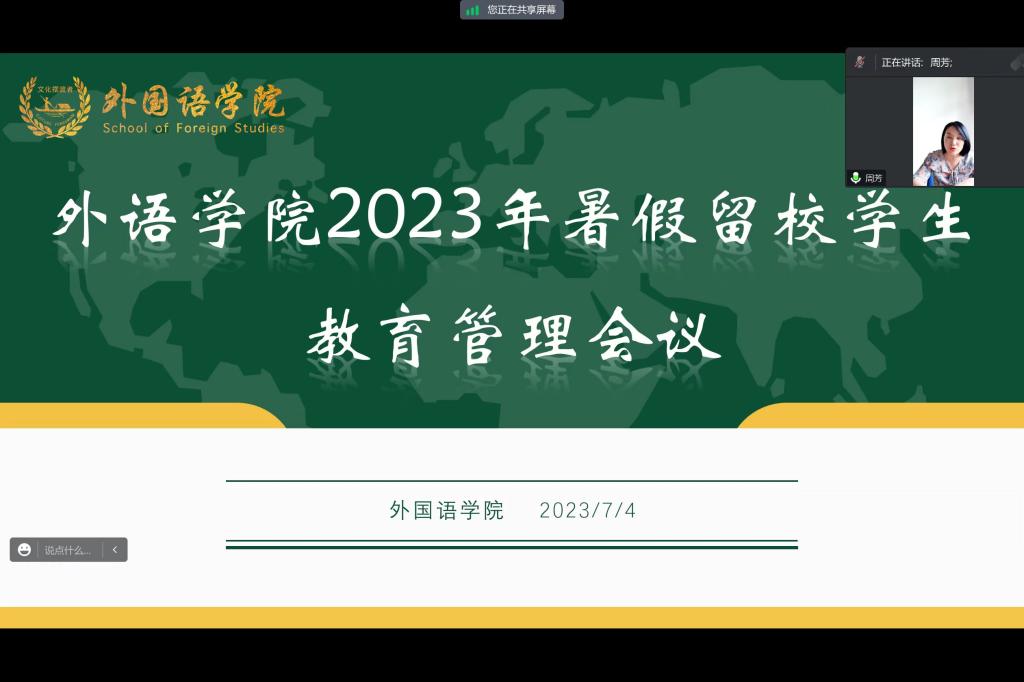 为进一步做好暑期留校安全教育工作,7月4日下午,外国语学院召开2023年度暑期留校学生安全教育会议,外国语学院党委副书记周芳、部分班主任及硕士生导师、全体辅导员及暑期留校学生参加会议。