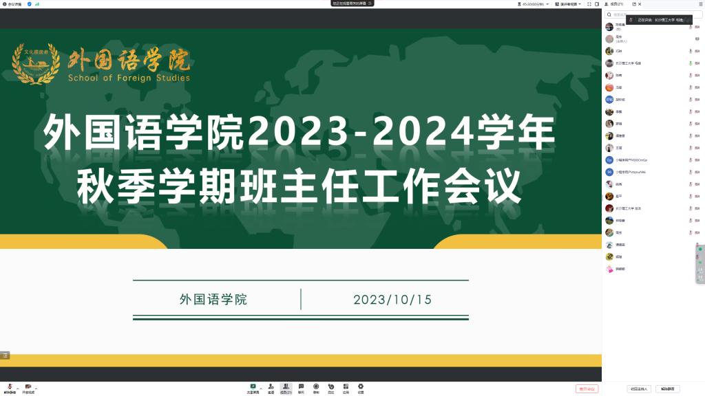 10月15日晚,外国语学院于线上召开班主任工作会议,学院党委副书记周芳出席,全体班主任、辅导员参加,会议由学工办主任武巧琳主持。