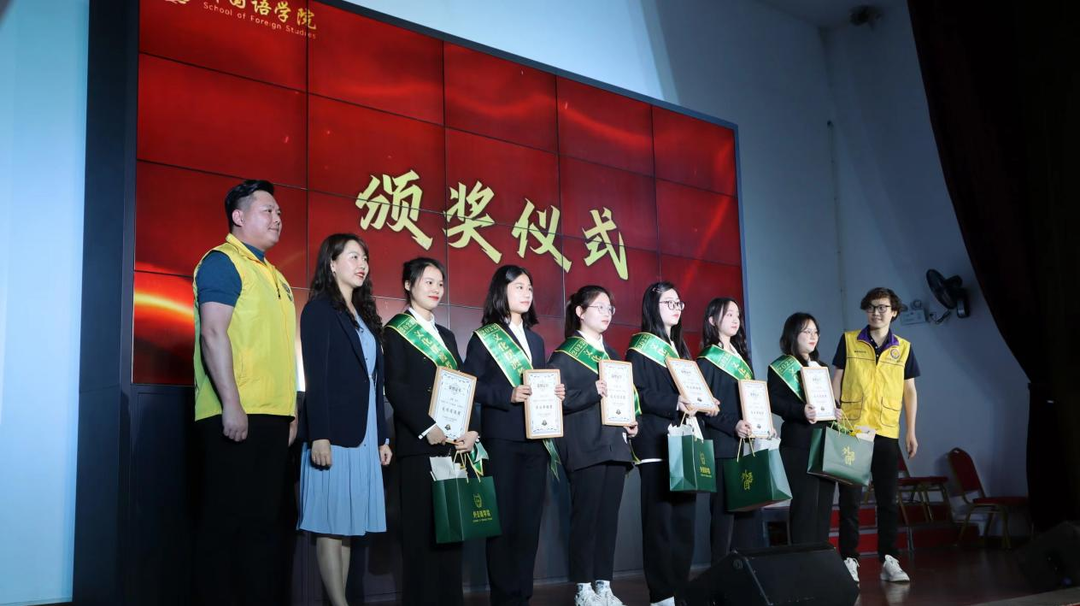 佛山市三水区白泥镇党委书记喻晓坤、佛山市晋雄实业有限公司董事长邱军等社会爱心人士,开云kaiyun体育关工委常务副主任王乃厚、校友中心主任郑延恒、学生工作部副部长陶传谱、校工会副主席王双、外国语学院党政领导班子及有关师生出席颁奖典礼。