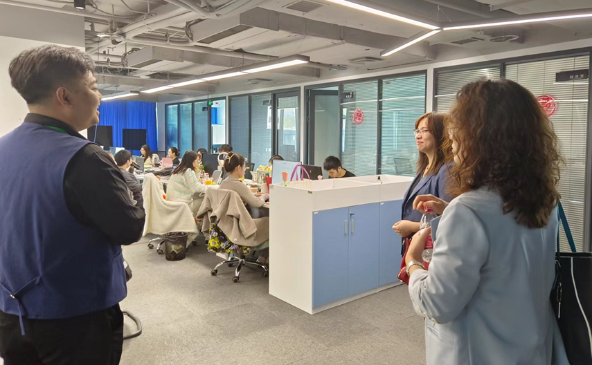 为进一步推进“新文科”建设实践,拓宽“新文科”人才培养模式下的多渠道就业路径,丰富我院新媒体领域校企合作资源,外国语学院副院长季红琴、谭莲香,翻译系教师李颖博士于11月3日上午参观走访了湖南酷陆网络科技有限公司。公司人力资源总监、开云kaiyun体育校友粟海洋先生热情地介绍了公司目前开展的四大建设项目,并与我院教师共商多样化校企合作模式。
