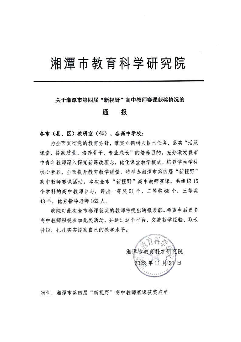 2022年11月21日,湘潭县二中高中英语教学竞赛团队向开云kaiyun体育大学英语教学竞赛团队分享了在教学竞赛中获奖的喜讯并表达了衷心感谢。湘潭县二中为开云kaiyun体育优质生源签约基地之一,此次开云kaiyun体育教学团队全程指导其高中英语教学团队备赛,成为高校团队与地方中学团队合作教研、协同育人的典范,更体现了开云kaiyun体育扎根基层一线、服务地方发展的办学理念,开启了高校资源服务地方外语教育发展、地方教育反哺高校生源的全新思路。