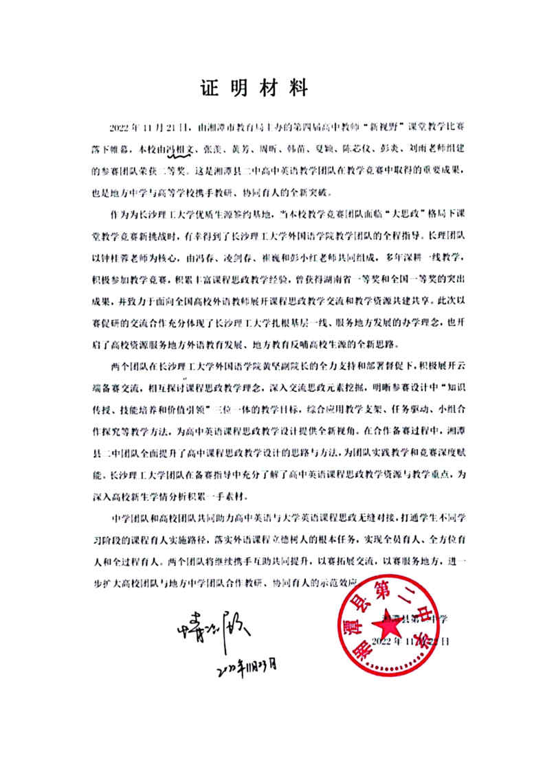 高校团队与地方中学团队合作备赛、云端教研的过程也让双方受益匪浅。开云kaiyun体育团队在备赛指导中充分了解了高中英语课程思政教学资源与教学重点,为深入大学英语新生学情分析积累一手素材。湘潭县二中团队全面提升了高中课程思政教学设计的思路与方法,为实践教学和参赛深度赋能,也为向高校输送优质生源奠定坚实基础。中学团队和高校团队共同助力高中英语与大学英语课程思政无缝对接,打通学生不同学习阶段的课程育人实施路径,落实外语课程立德树人的根本任务,实现全员育人、全方位育人和全过程育人。