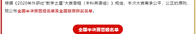 外国语学院外国语言文学系胡伟、罗娟、胡珍铭、张志武组成的《学术英语写作》课程团队荣获2020年外研社“教学之星”大赛复赛英语专业组特等奖,并晋级大赛的全国半决赛。