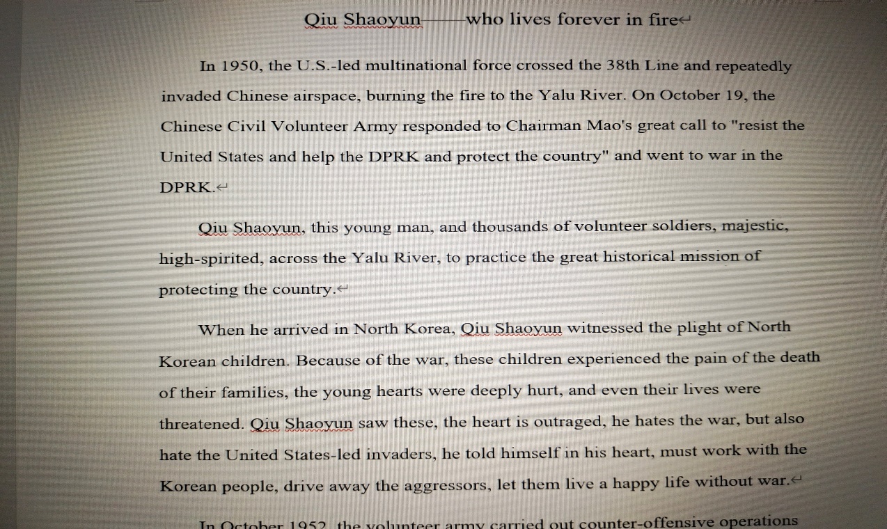 2021年8月6日,来自开云kaiyun体育外国语学院党史学习实践团的邱月琴在家中对邱少云的英雄事迹进行了汉译英的翻译。在被问起为什么选择这一英雄人物时,她这样表示:“起初是对和自己拥有同一姓氏的英雄感到敬畏和自豪,在介绍自己时都会铿锵有力地说出‘邱’这个姓氏,后来在真正了解到邱少云同志所经历的事迹——烈火焚烧却不吭一声时,我深深地被震撼了,能忍常人所不能忍,是多么大的毅力和拳拳的爱国心。”