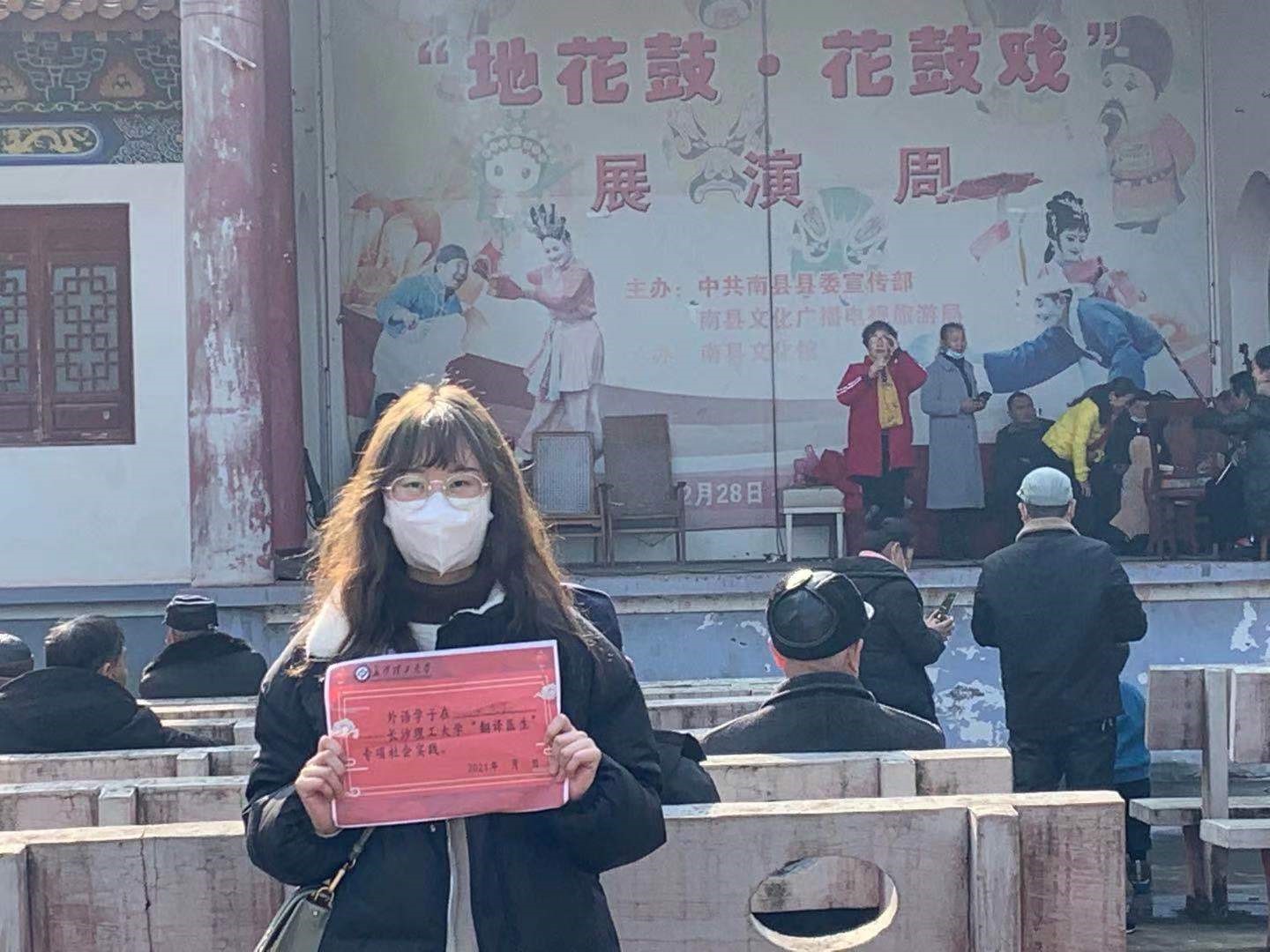 2021年1月28日,为了积极响应学院的号召,传播家乡非物质文化,外国语学院翻译1802班周媛媛对家乡的非物质文化遗产“南县地花鼓”进行了相关的调查。此次活动,她采取了网上搜集资料、走访当地居民、切身感受花鼓戏的方式对南县“地花鼓”展开了全面的调研。