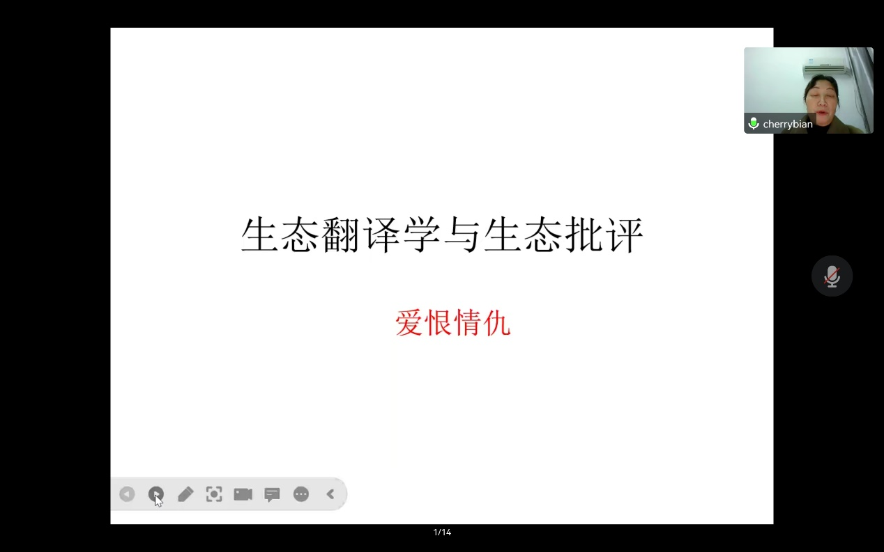 2022年12月14日晚,我院边立红副教授应邀为开云官网第十八届博力学术论坛“翻译生态与生态翻译”专题论坛做了题为“谈谈翻译的自然维度”的讲座。外国语学院部分导师及全体研究生参加了本次讲座。