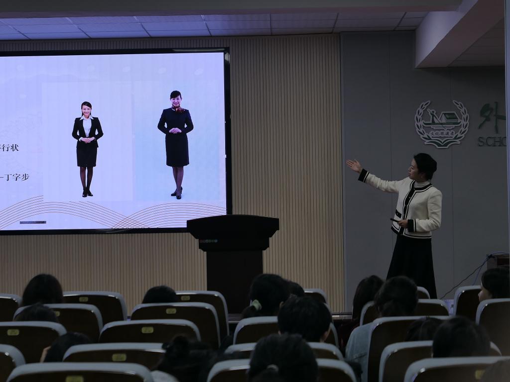 讲座中,冯叶老师为同学们介绍了湖湘历史背景文化,让同学们对星城长沙有了更深入的了解。她讲道:“经济只是城市的体格,文化才是灵魂”。山水洲城的奇妙组合,在这片土地上孕育出独特的湖湘文化,赋予了长沙独特的城市魅力。接着,冯叶老师从岳麓山书院讲到橘子洲头,从太平老街讲到IFS国金中心,从梅溪湖文化艺术中心讲到三一重工,都印证着这座城市拥有穿越时空的历史文化传承,是古朴与摩登的交织,艺术文化与制造业中心的融合。随后,从自身工作经历入手,冯叶老师又为大家进行了职场经验分享和礼仪知识培训,分别讲解了站、坐、走规范姿势与职业体态规范。同学们从她专业的介绍中收获了许多求职技巧。