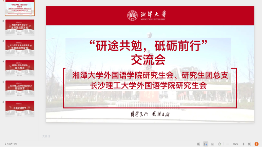 “实践出真知,交流促成长”,为进一步加强院校之间的交流与合作,提升研究生会服务意识及工作水平,开云kaiyun体育外国语学院研究生会与湘潭大学外国语学院研究生会、团总支于5月16日晚以线上会议的形式联合举办了“研途共勉,砥砺前行”主题交流会,由湘潭大学外国语学院研究生会谭筝主持。
