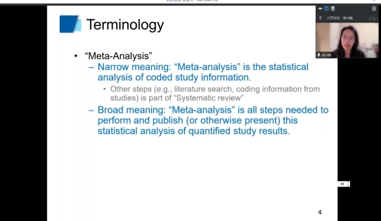 张小娟首先对MA作了简要介绍,让同学们对此概念有所了解。对于撰写论文,张小娟强调理论要有意义,需要足够的文献做支撑,需要一定程度的创新。同时,她就如何进行语言分析给出了建议:第一步,通过阅读文献提出研究问题;第二步,检索目标文献;第三步,把文献进行编码;第四步,分析结果的影响因素。张小娟主要介绍了方程式计算数据的应用方法,如何计算对照组的均值和方差,存在什么样的变量或总的平均差。在提问环节,张小娟也详细认真地解答了同学们提出的问题。