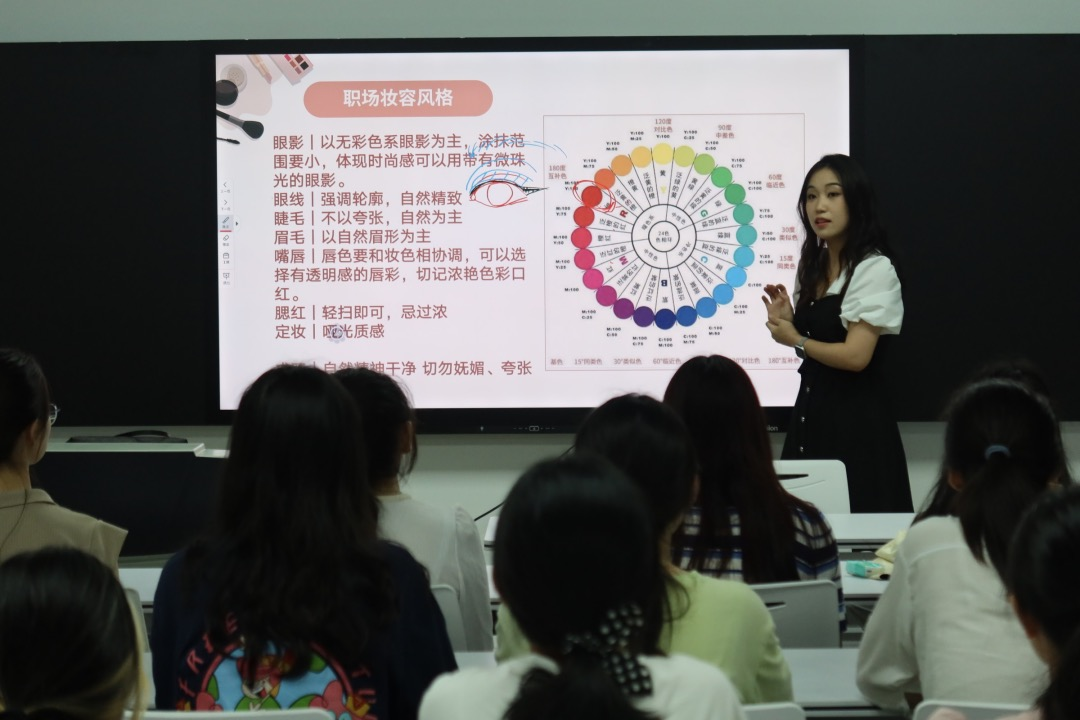 樊明焱老师以理论知识分享和现场实践演练为主线展开培训,她鼓励同学们通过多次尝试,找到适合自己的化妆风格,熟练掌握扬长避短的技巧,使职场妆容更具吸引力。她强调:“职场妆容应该符合工作环境与特点,呈现出理智与成熟的化妆效果。”同时樊老师还向同学们介绍了妆色、妆感的差异对人的不同影响,分析了无效化妆的原因。