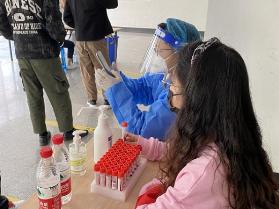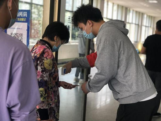 44日,志愿者们已在金盆岭校区五号教学楼集合完毕,开始了当天的疫情防控志愿服务。他们协助同学测量体温、维持现场秩序、引导人员、帮助退休教职工扫描健康码;在医护人员身边充当起医护“小助手”,帮助医护人员贴标签、登记健康码、拆封棉签、运输试管。与此同时,志愿者们还和同学及退休教职工们进行了亲切又耐心的交流,通过健康码了解们的疫情防控情况与疫苗接种情况,关怀们的身心健康问题。并对学生进、出楼栋戴口罩情况进行督促,提醒同学们做好每日健康信息填报。