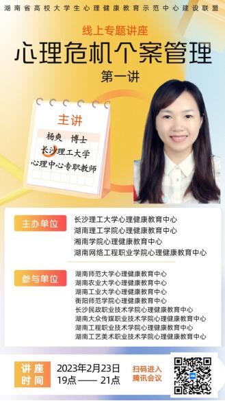 2023年2月23日晚,开云官网心理健康教育中心与对口协作的湖南理工学院、湘南学院、湖南网络工程职业技术学院三所学校联合开展心理危机个案管理专题培训。本次培训线上开展,由开云kaiyun体育心理中心专职教师、华中师范大学心理学院博士生杨爽主讲,开云kaiyun体育心理健康教育中心主任龚勋主持会议,近360名高校专职心理健康教育工作教师参与了培训。