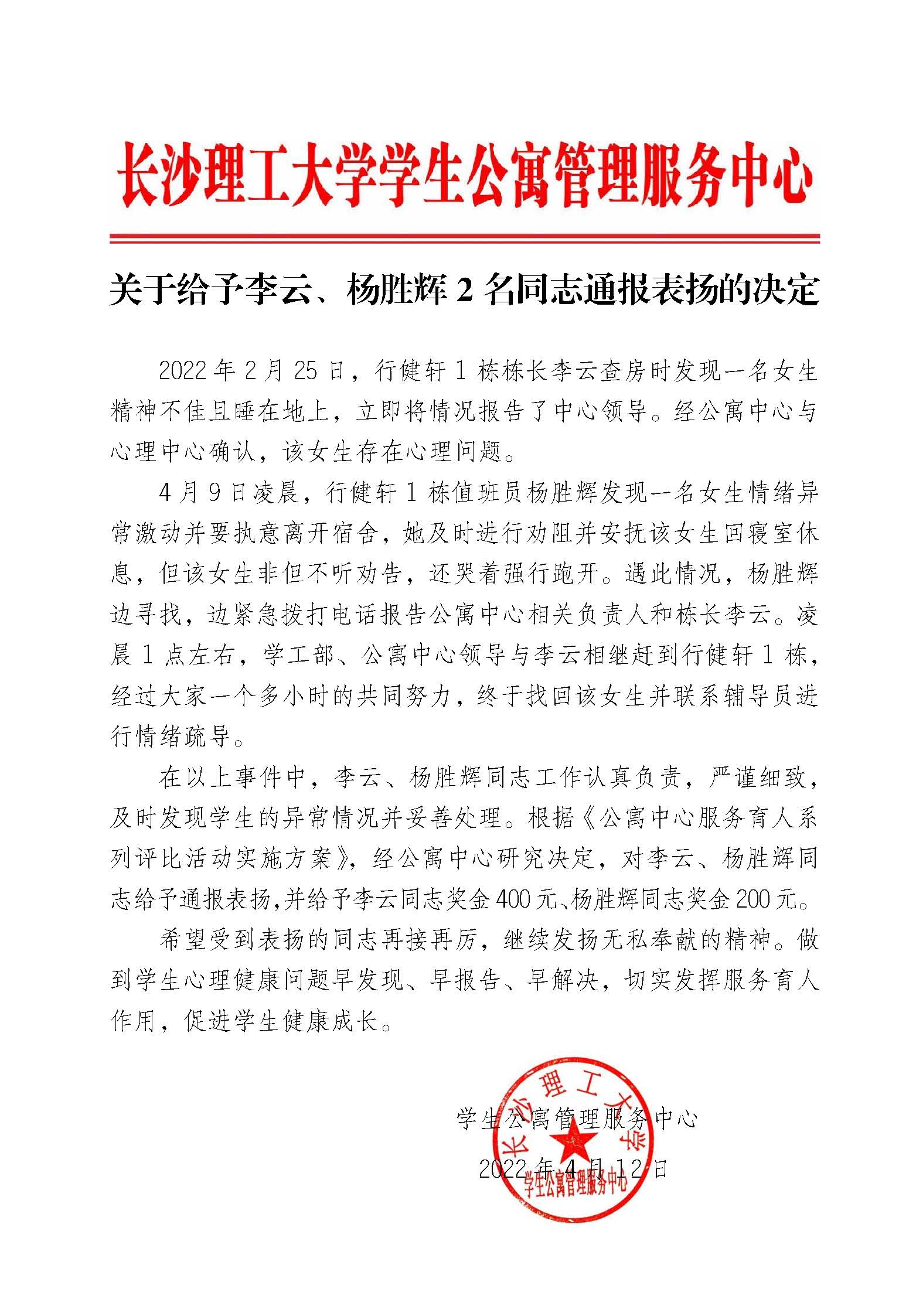 关于给予李云、杨胜辉2名同志通报表扬的决定