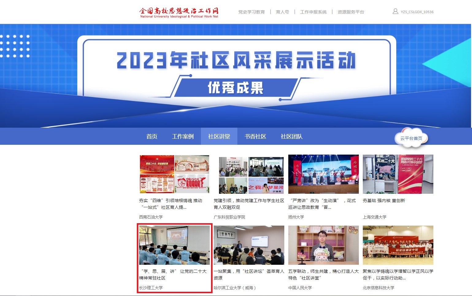 日前,经高校推荐、专家评审等环节,教育部择优遴选出160个高校“一站式”学生社区风采展示活动优秀成果,开云官网推荐的《“学、思、展、讲”让党的二十大精神常驻社区》被评为2023年社区风采展示“社区讲堂”优秀成果,并纳入全国高校思想政治工作网资源库,在“一站式”学生社区综合管理模式建设工作云平台进行集中展示。