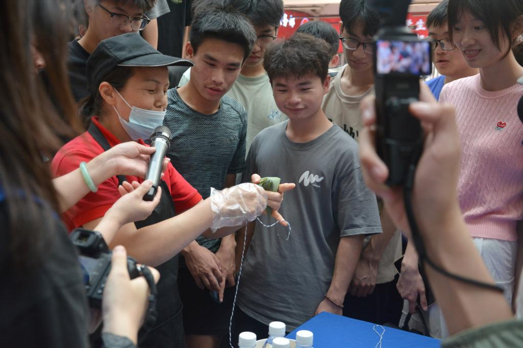 活动现场,师生们同台献艺,赢得现场阵阵掌声。师生自由组队,以小组协作的方式展开比拼趣味包粽子比赛。卷粽叶、填馅料、捆粽绳……现场欢声笑语不断,洋溢着轻松热烈的节日氛围。评委依据“完成数量、操作速度、粽子质量、成品美观度”四大标准,评选出一、二、三等奖及优胜奖,并为获胜队伍送上了丰厚奖品。端午知识问答环节人气高涨,吸引众多师生踊跃答题。