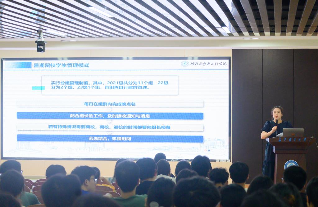 7月11日,能动学院在工三A307开展暑期留校学生安全教育大会,会议由2021级辅导员罗亦欧主持,2022级辅导员胡雅妮、241位留校学生参会。