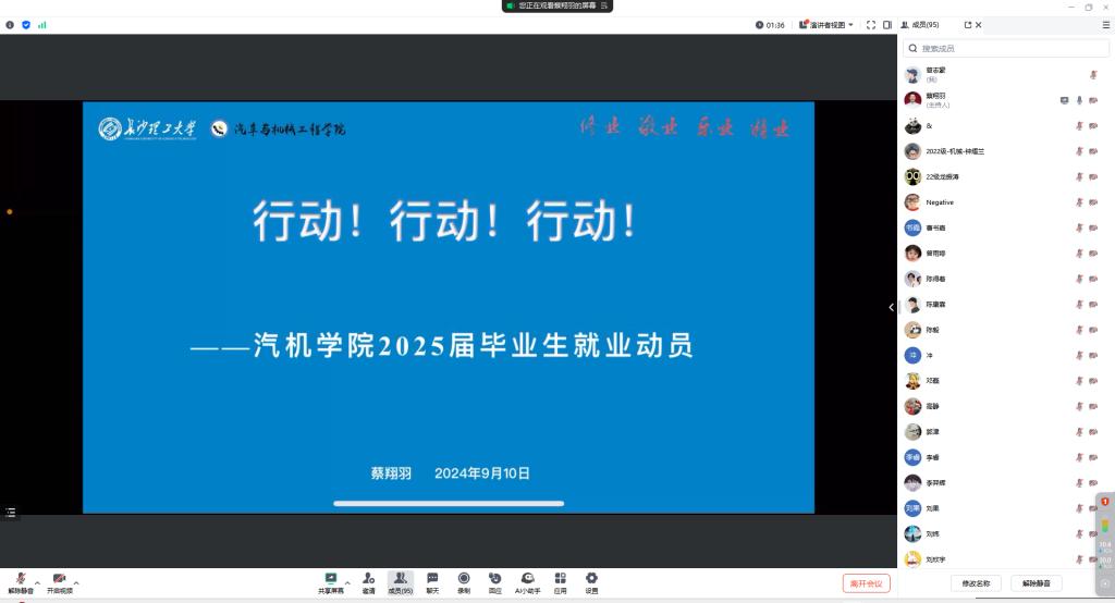 9月10日,汽机学院召开研究生就业动员和就业指导会议,学院党委副书记周小杰、研究生辅导员彭琼英、就业专干蔡翔羽以及100余名硕士毕业生参与了此次会议。蔡老师从往届研究生就业情况、25届就业形势介绍、签约流程和注意事项等方面进行培训,周书记勉励同学们:“行动是解决焦虑的唯一办法,请大家端正态度、主动出击、决胜秋招。”