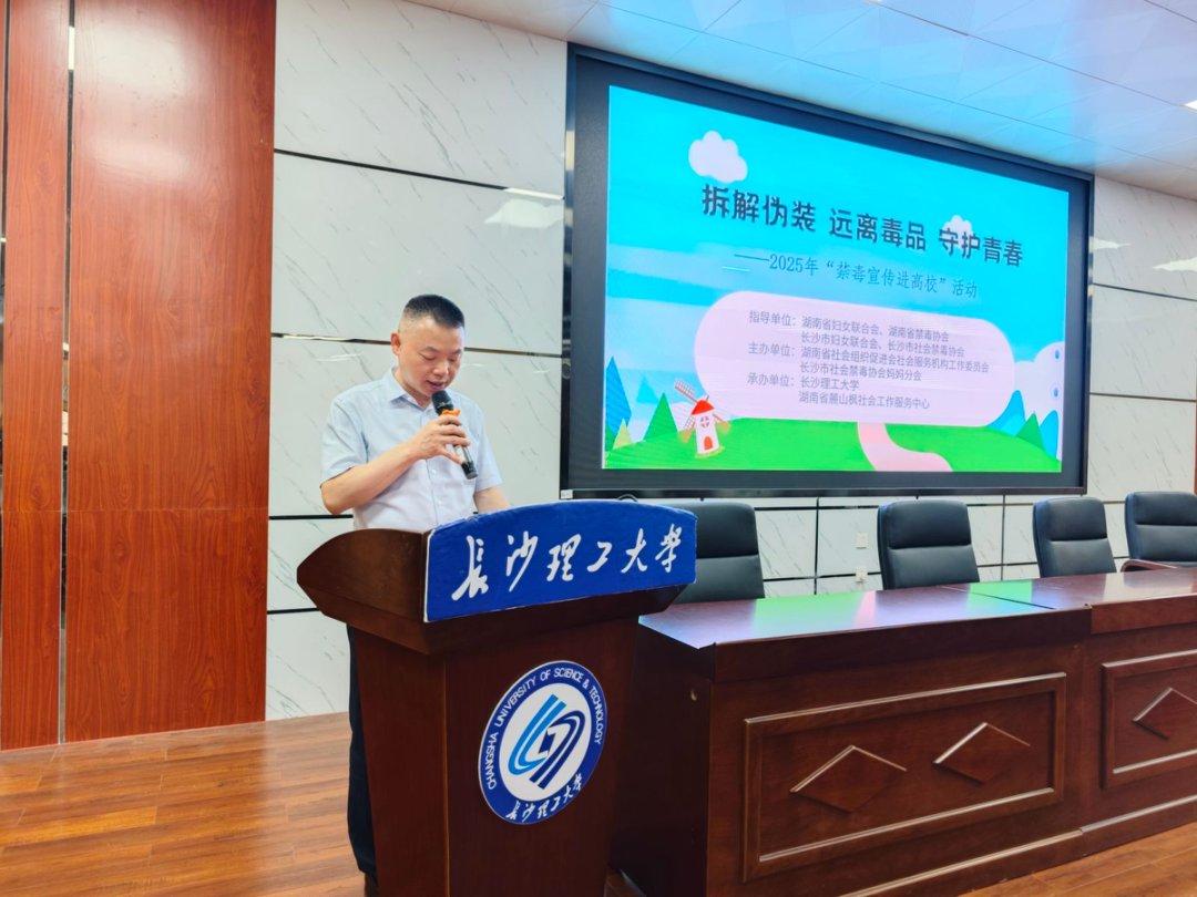 为深入贯彻习近平总书记关于禁毒工作的重要指示批示精神,落实相关部门对青少年毒品预防教育的部署,6月20日上午,一场以“拆解伪装 远离毒品 守护青春”为主题的“禁毒宣传进高校”活动在开云kaiyun体育金盆岭校区四号教学楼报告厅顺利举办。湖南省禁毒协会副秘书长张莉、开云kaiyun体育法学院党委书记龚文斌、法学院党委副书记兼副院长汪伦、开云kaiyun体育党委保卫部副部长林杰等领导,与禁毒工作人员及开云kaiyun体育各学院学生代表齐聚一堂,共同参与了这场意义重大的禁毒宣传活动。