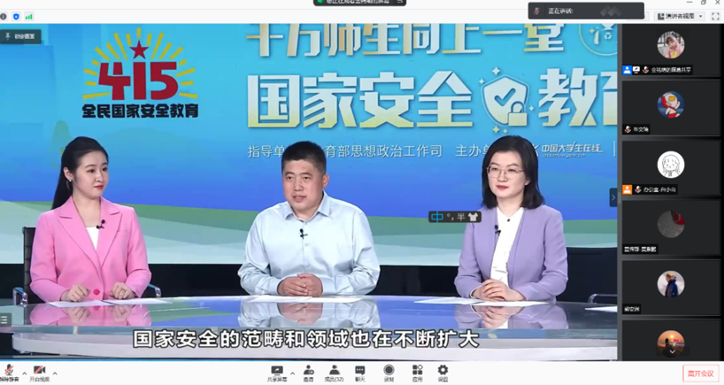 下午三点,校团委老师与全体学生干部一起通过腾讯会议集体学习观看了“千万师生同上一堂国家安全教育课”主题公开课。课上,专家老师对国家安全的范围,大学生维护国家安全的做法进行了生动的解读。课后青年学生们纷纷表示深受教育,莫紫鹏同学说:“宪法规定的关于公民维护祖国安全、荣誉和利益的基本义务,通过学习教育我充分认识到了坚持总体国家安全观的重大意义。”