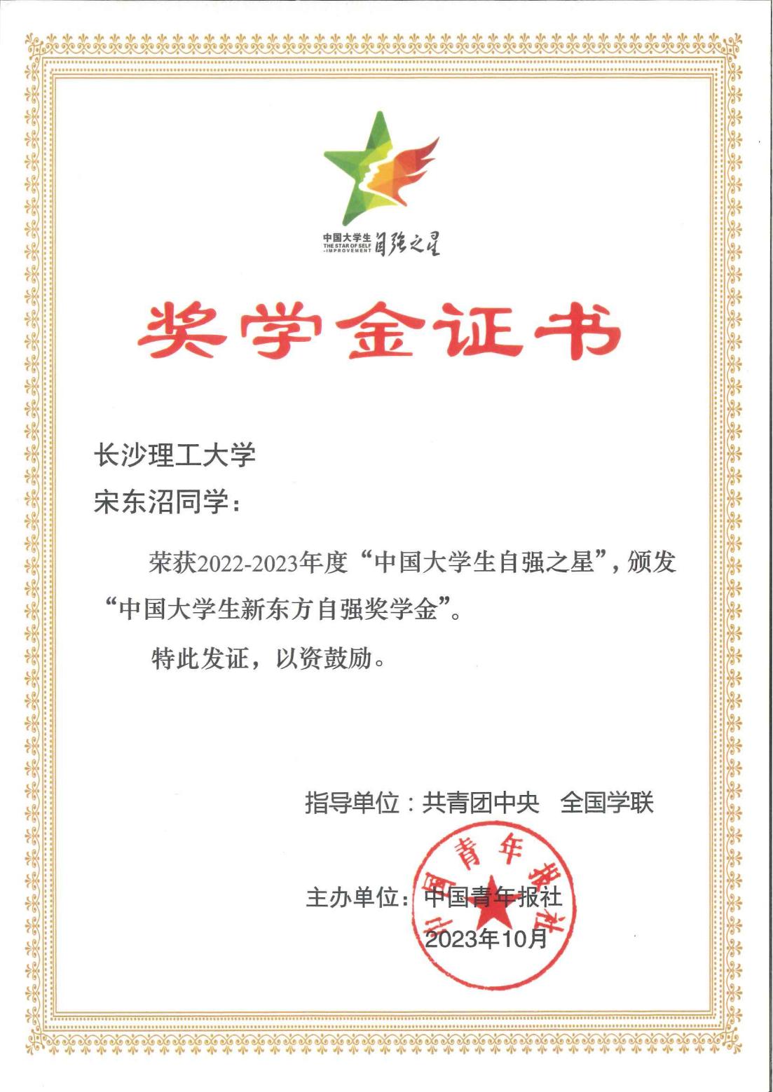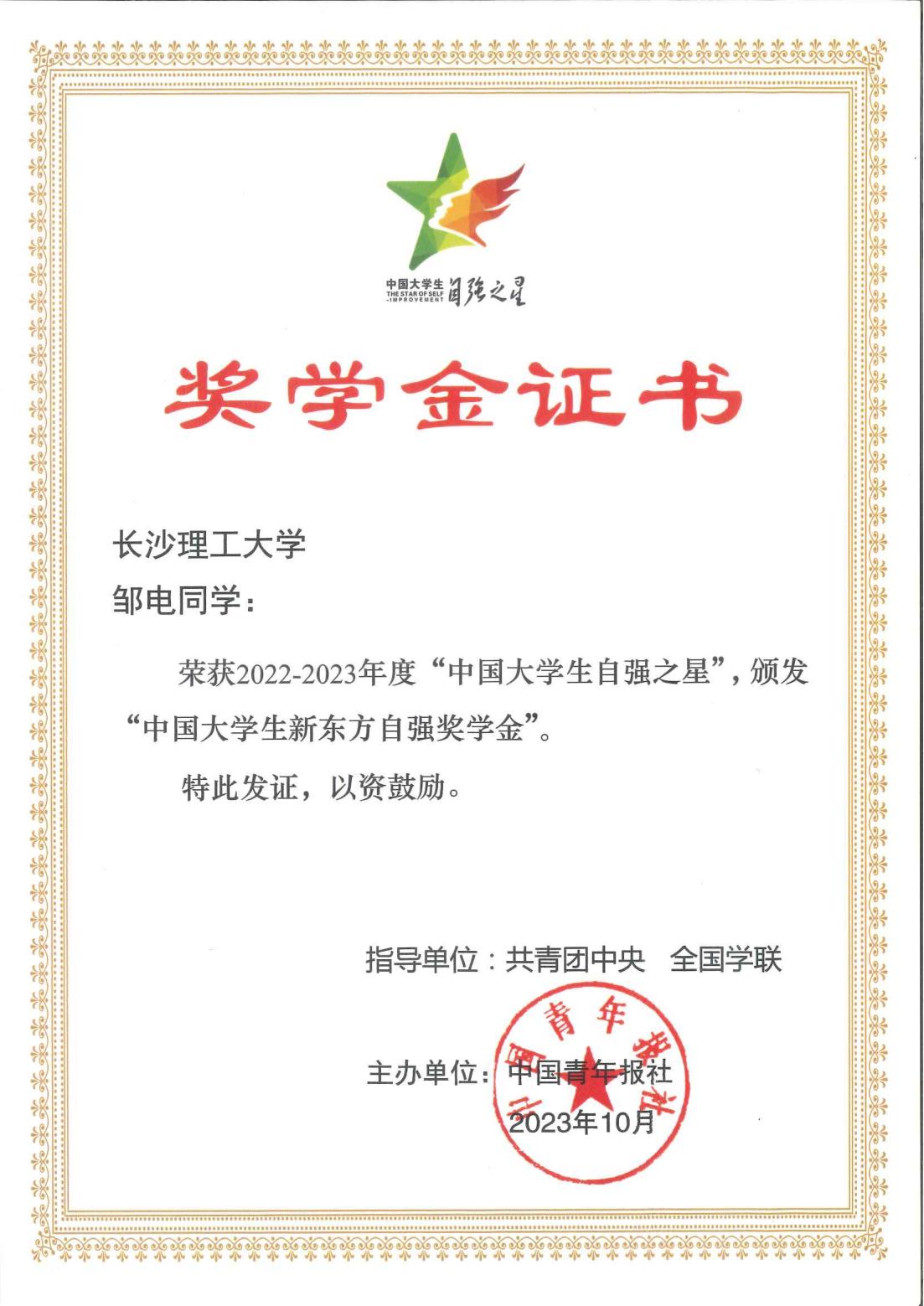2022年8月20日,由共青团中央、全国学联指导,中国青年报社、新东方教育科技集团、中国青年创业就业基金会联合开展的2022年度“中国大学生自强之星”奖学金推报活动结果揭晓,开云官网汽机学院2020级本科生宋东沼同学和计通学院2020级研究生邹电同学从众多学子中脱颖而出,荣获2022年度“中国大学生自强之星”。