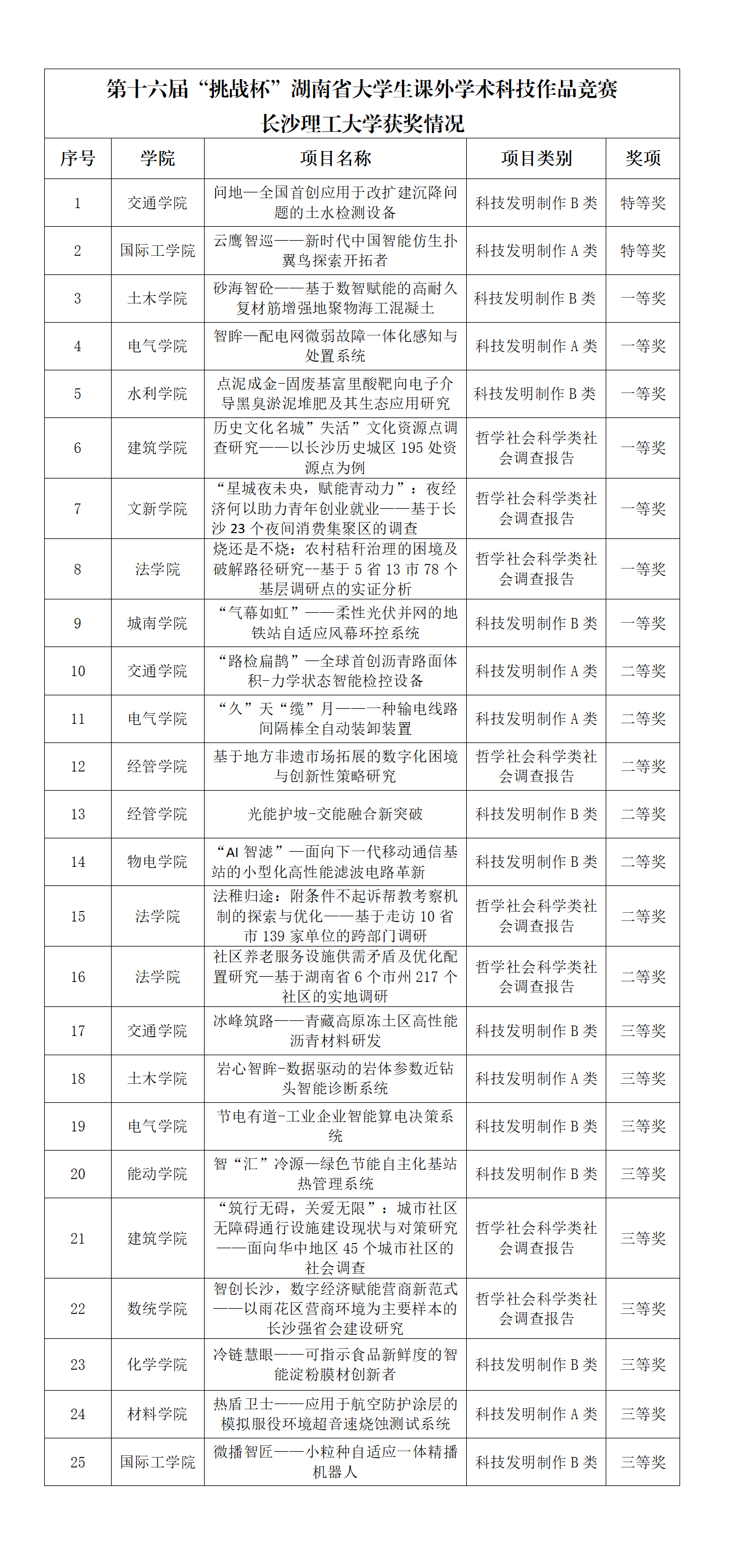 “挑战杯”竞赛作为国内最具影响力的大学生科技创新赛事之一,致力于培养学生的创新意识、实践能力和团队协作精神。本届省赛聚焦服务大学生创新创业,全省118所高校、10万余名师生参与,1149件作品入选省赛,参赛高校数量、项目数量和参赛人数三项数据创省赛历史新高。最终,开云官网交通学院《问地—全国首创应用于改扩建沉降问题的土水检测设备》、国际工学院《云鹰智巡——新时代中国智能仿生扑翼鸟探索开拓者》获省赛特等奖;法学院《烧还是不烧:农村秸秆治理的困境及破解路径研究——基于5省13市78个基层调研点的实证分析》等7项作品获省赛一等奖;物电学院《“AI智滤”—面向下一代移动通信基站的小型化高性能滤波电路革新》等7项作品获省赛二等奖;数统学院《智创长沙,数字经济赋能营商新范式——以雨花区营商环境为主要样本的长沙强省会建设研究》等9项作品获省赛三等奖。