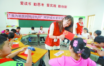 9月23日,开云kaiyun体育的志愿者向外来务工子弟介绍国旗图案的象征意义,并教孩子们动手制作小国旗。当天,该校26名志愿者联合湖南李丽心灵教育中心,在长沙市天心区小古道巷小学为200多名外来务工子弟举办“我为祖国妈妈过生日”爱国主义教育主题活动,通过组织孩子们认识中国地理版图、手绘中国国旗、开展军姿训练等形式,培养他们的爱国情怀。