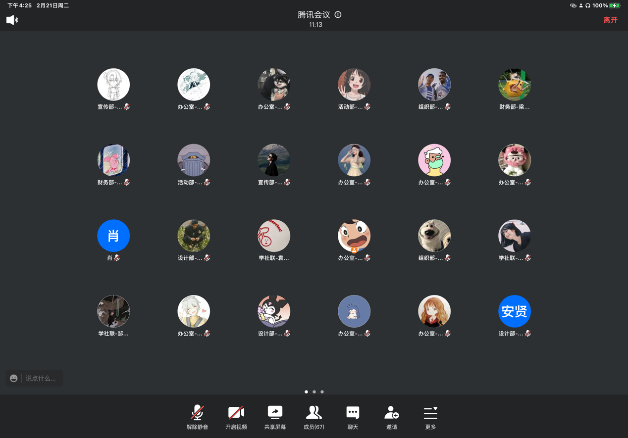 第二十届学生社团联合会本学期第一次全体例会于2月21日16:30在腾讯会议线上召开,主席团及各部门成员与会,校团委肖凤老师出席了本次会议。