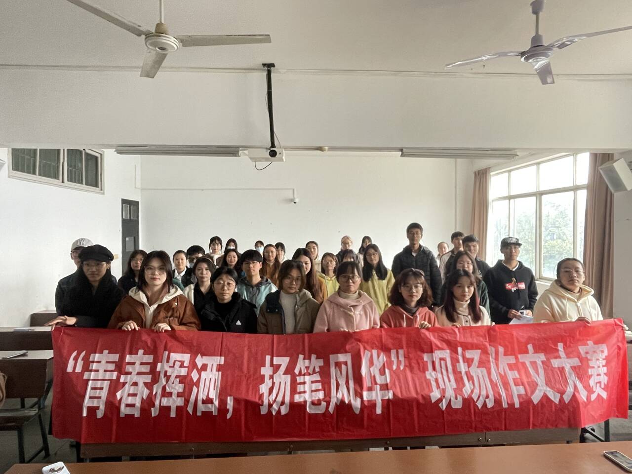 在活动开始之前工作人员已全部到位,并按规定程序为楼管提供教室租借申请,在第一时间打扫教室卫生和张贴比赛海报和横幅,并在场内迎接活动参与者的到来。随后,主持人讲解相关活动规则和比赛具体流程,同时参与者也在本次活动中积极地展示自身的文学才华,教室寂然无声,只见得落笔时的轻盈和抬笔时的飘逸。