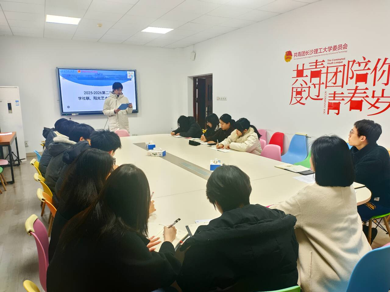 2025-2026学年第二学期学生社团联合会(以下简称“学社联”)、阳光艺术团交流会于3月17日14:30在云塘校区学生活动中心A301顺利开展。团委挂职副书记张歌林出席会议,学社联及阳光艺术团代表与会。