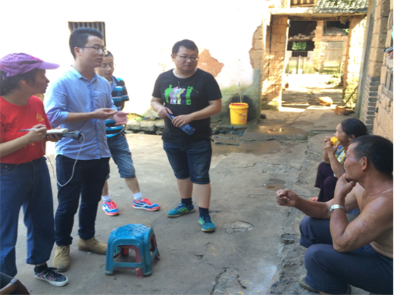 9日下午,在经历了一段弯曲的小道后,团队顺利抵达目地的周家岭。刚到调研点,团队据立刻进入状态,不久便开始了第一次的农村个体户的专访。通过一番简短的对话,曾凯与魏甫、陈锋大致了解了该户的家庭经济构成。之后,团队成员们询问了该户调研相关情况。