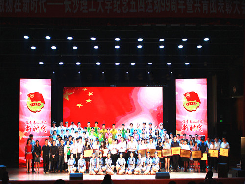 大会对2017-2018年度获得“全国活力团支部”、“全国最具影响力社团联合会”、“湖南省百优社团”和学校“红旗团委”、“红旗团支部”、“青年五四奖章”、“十佳团学干部”、“十佳团支书”等荣誉称号的先进集体和个人进行了表彰。表彰大会以音诗画《一封家书》拉开了序幕,带我们重温了炮火纷飞的年代里那催人泪下的一封封抗战家书;十佳团支书带来的《我的支部我的团》让同学们感受到基层团支部负责人的奉献精神;舞蹈《芳华》带我们回到了那个挥洒热血的时代;《不忘初心,逐梦前行》展示了艺术学院产品1503团支部扎实学习、勤奋创造的精神风貌;《我们是长理人》由校院两级学生会主席抒发了长理青年为祖国干事创业的雄心壮志;“长理青年”宣誓仪式,让每一个长理青年深感共鸣,激发出强烈的爱国爱校情怀;话剧《此时此刻》表达了长理校友在祖国南海挥洒汗水、为祖国负重前行的心声。大会在全场合唱《我爱你,中国》歌声中结束。