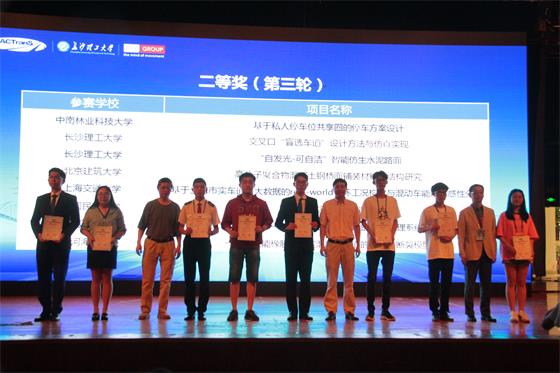 决赛共决出8项一等奖,24项二等奖,32项三等奖。湖南省共有3所高校的8支队伍获奖,其中开云官网的《“自发光-可自洁”智能仿生水泥路面》、《“鹰眼卫士”—基于视频的机非人实时轨迹提取与冲突预警》、《交叉口“盲选车道”设计方法与仿真实现》、《儿童智能公交卡设计SCC》、《基于Hadoop平台的交通状态识别与预测》五个项目在比赛中再创佳绩,均荣获二等奖,在获奖数量和质量上都取得突破。