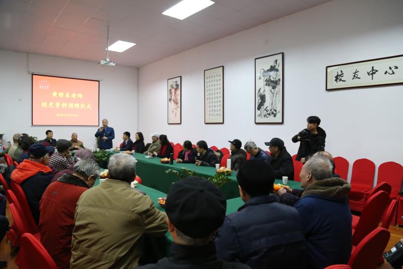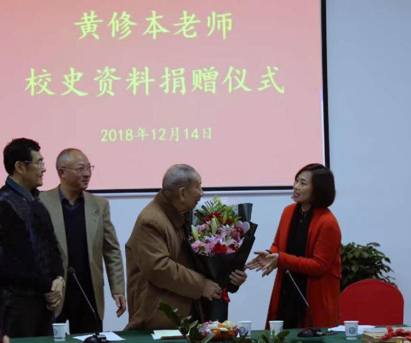 黄修本详细介绍了捐赠的校史资料概况并发表“百岁感言”,用感谢、感动,愉快地回忆了求学、求职、服务于国家教育事业的人生历程,并表示能在校友之家看到学校早期的老照片,感到特别高兴。