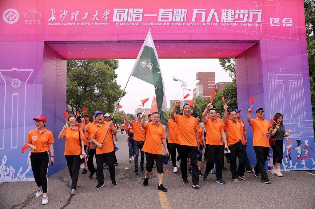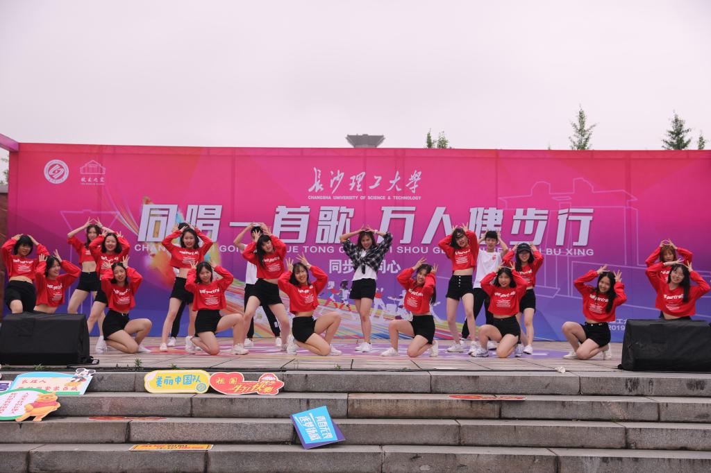 10时左右,大部分参赛队伍到达文化广场。参赛者纷纷凭印章领取校友之家特制的精美纪念奖牌,并在颁奖台、运动墙、“长理号”列车前合影留念。在文化广场上,曳舞社、民族舞蹈协会、跆拳道协会、学社联等学生社团为大家展示了热情奔放、活力四射的表演,点燃了所有在场者的激情。最后,参赛者、参演者再次在校友合唱团的带领下齐声合唱《我和我的祖国》《歌唱祖国》等经典曲目,将活动气氛推向了最高潮。越来越多的师生被吸引感染,用歌声、掌声、欢呼声加入合唱队伍,大家共同向祖国母亲送上最深情的告白:“长理人在长沙,祝福祖国繁荣昌盛!”