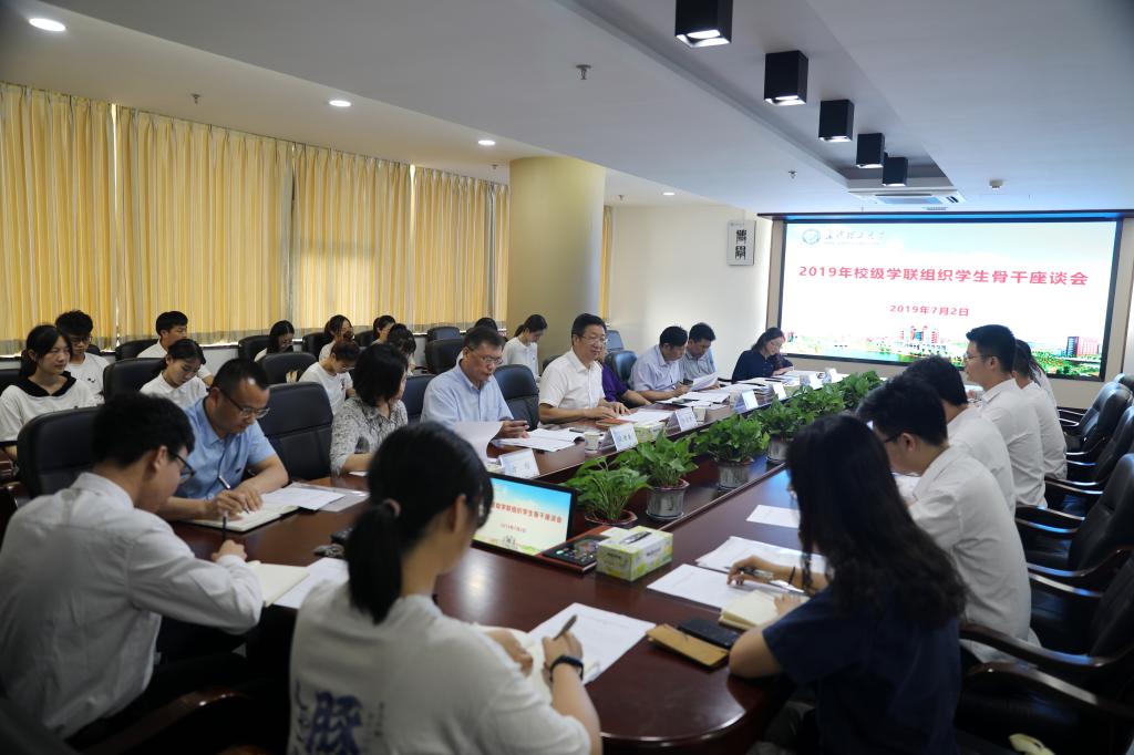7月2日下午,2019年校级学联组织学生骨干座谈会在云塘校区一办公楼六会议室举行,党委书记付宏渊,党委副书记邹宏如,副校长谈传生,党委委员、组织部部长齐路良、宣传部部长方琼,学工部部长艾楚君、研究生院副院长兼研工部部长刘亚辉、校团委专职团干及校学生会、研究生会以及学生社团联合会33名学生骨干参加了座谈。会议由校团委副书记文丽丽主持。