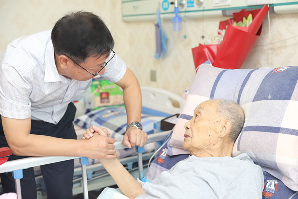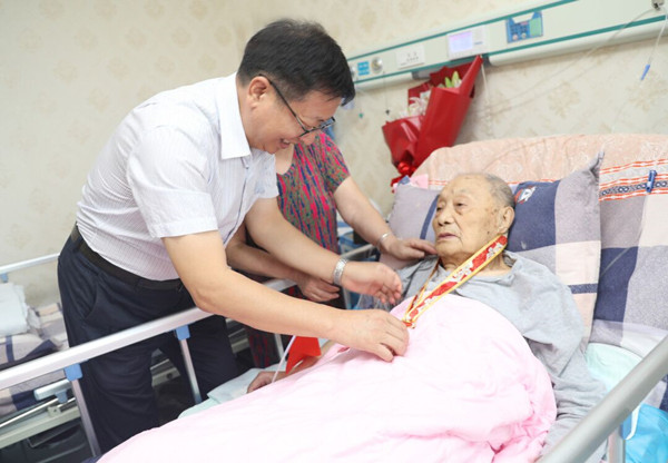 9月30日上午,校党委书记付宏渊在党委副书记邹宏如、党委委员方琼及有关单位负责人陪同下,专程赴长沙市融城医院看望慰问102岁的离休干部常禹纯。付宏渊亲自为常禹纯老人佩戴了中共中央、国务院、中央军委颁发的“庆祝中华人民共和国七十周年纪念章”,代表学校党委、行政感谢常老为新中国的成立、学校的建设所作的贡献,并祝福老人生日快乐,身体健康,寿比南山。
