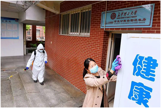 (宿舍管理员在给洗衣房打扫消杀。)