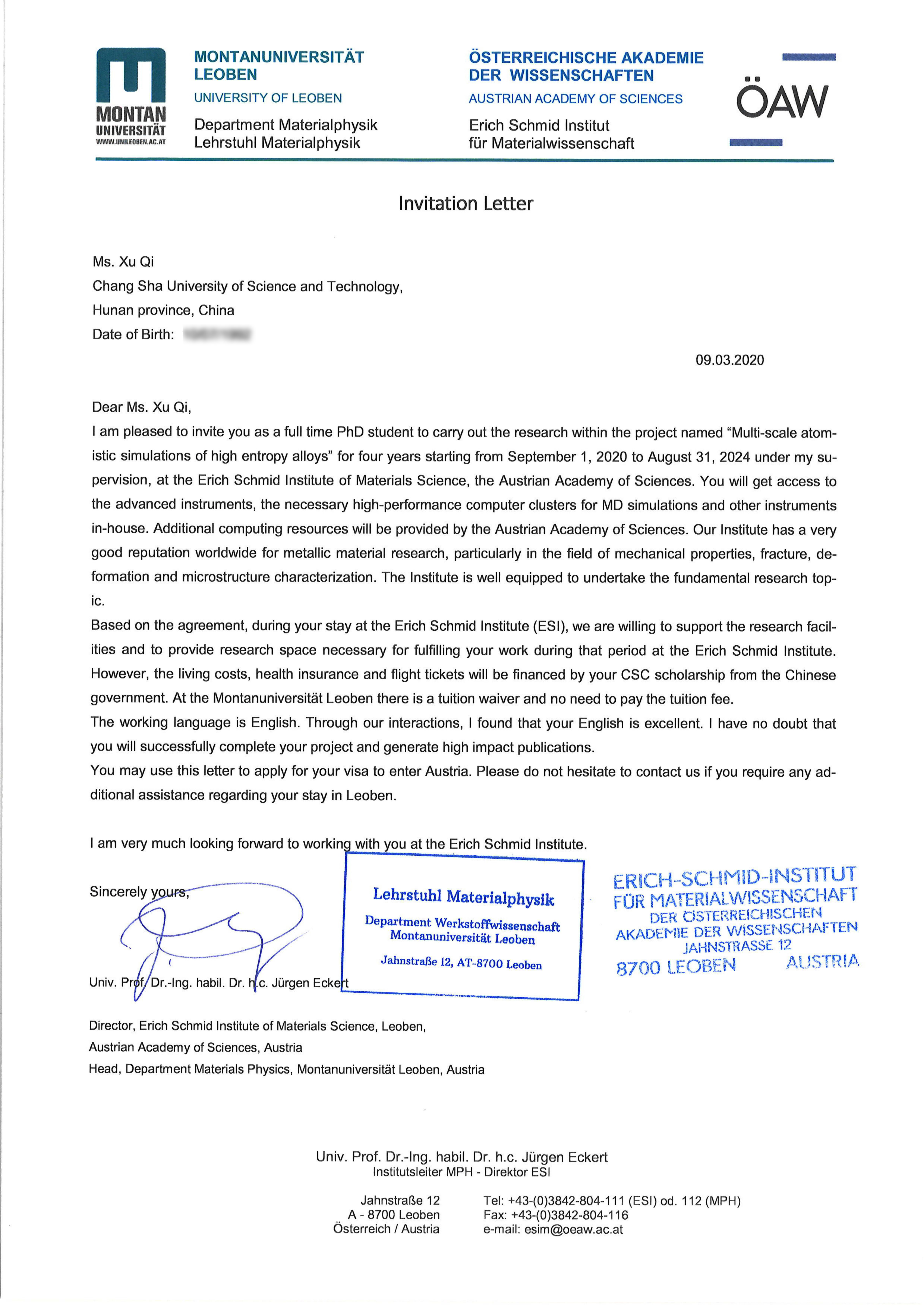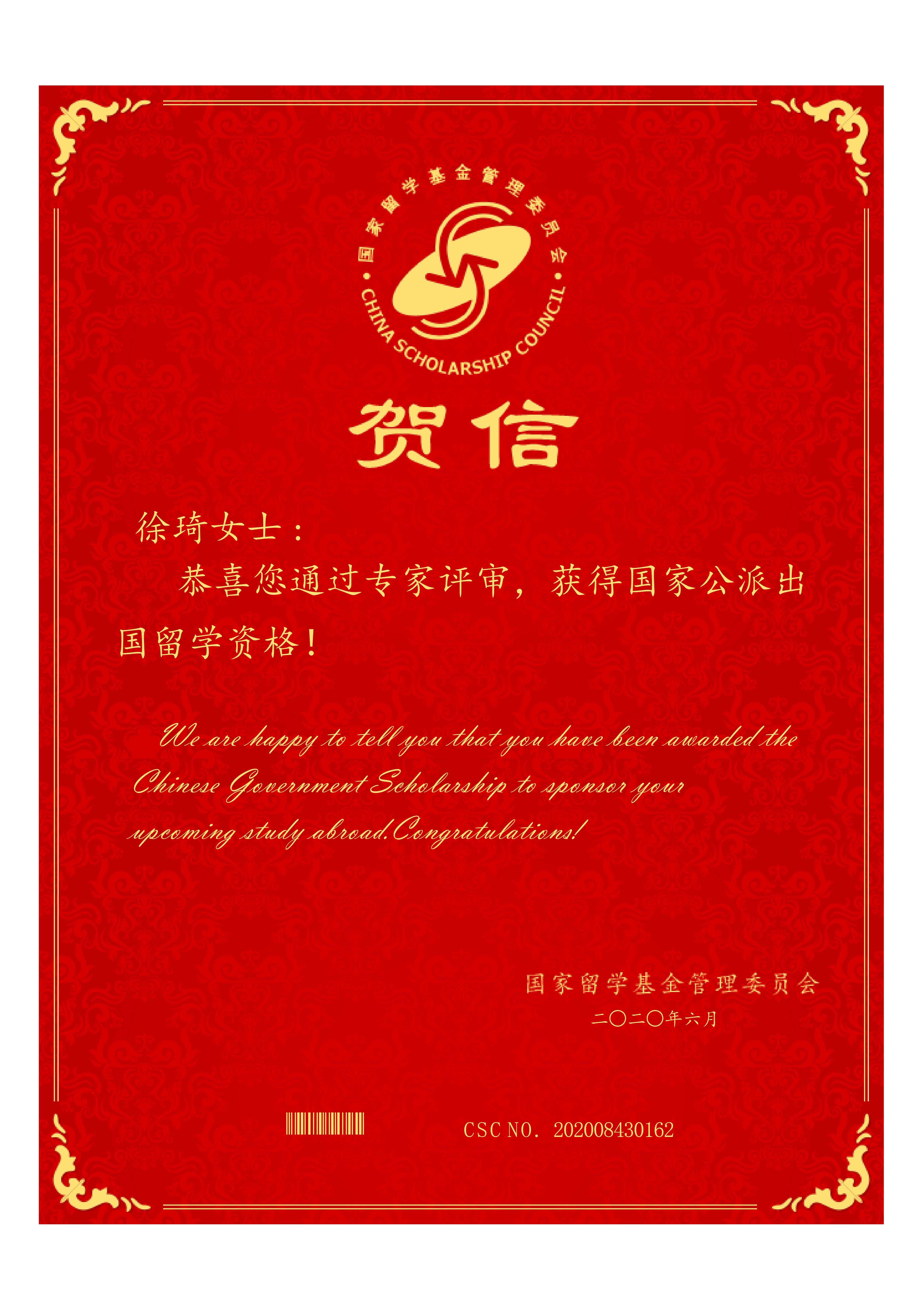 日前,国家留学基金管理委员会(以下简称“国家留学基金委”)公布了2020年度国家公派留学项目录取结果,开云官网汽车与机械工程学院2020届硕士毕业生徐琦成功通过国家留学基金委专家评审,获得2020年国家建设高水平大学公派研究生项目资格,将赴奥地利科学院攻读博士学位。