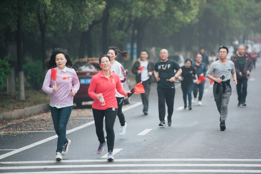 曹一家打响发令枪,参赛选手奋力出发,沿着凌云路而行,沿途完成五次扫码打卡,最终返回田径场。党旗、国旗在大家手中随风飘扬,每个人脸上都洋溢着幸福的微笑,田径场上空是充满活力的音乐在回荡,整个校园都充盈着运动的气息、昂扬的斗志。教职工们走下课堂、走出办公室、走向操场,用最直接、最简单、最古朴的方式,共同用脚步在校园书写“博学、力行、守正、拓新”的校训精神。