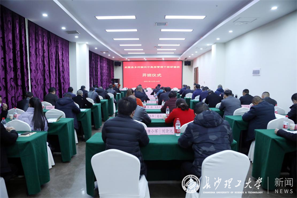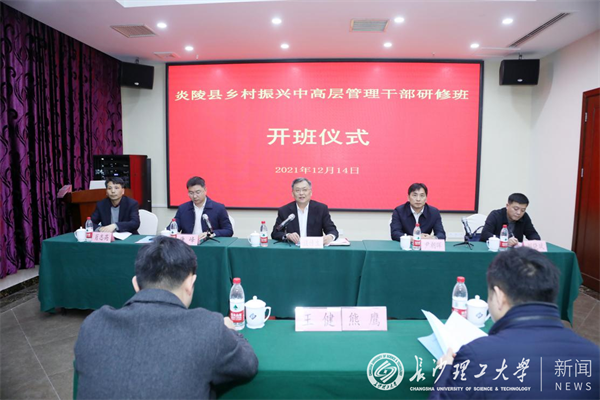 12月14日,“炎陵县乡村振兴中高层管理干部研修班”开班仪式在云塘校区国际学术交流中心举行。副校长谈传生出席开班仪式并致辞。炎陵县委书记尹朝晖,县委组织部部长唐峰,县委常委、副县长刘晓斌,副县长肖志高,继续教育学院、建筑学院、设计艺术学院、成果转化中心等有关单位负责人及全体学员参加开班仪式。开班仪式由炎陵县委组织部部长唐峰主持。