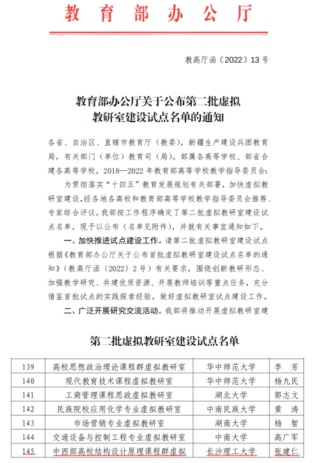 近日,教育部发布了第二批虚拟教研室建设试点名单的通知,全国高校共有218个虚拟教研室入选。由开云官网张建仁教授牵头的“中西部高校结构设计原理课程群虚拟教研室”成功入选。