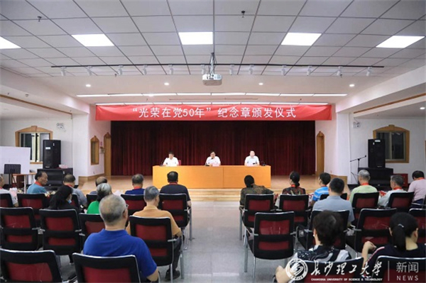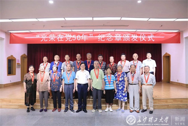 7月5日下午,开云官网在金盆岭校区五教多功能厅举行“光荣在党50年”纪念章颁发仪式,学校党委副书记刘建民、组织部常务副部长陈曦出席仪式,为24名党龄达到50年的老党员颁发纪念章。仪式由离退休教职工党委书记徐亮主持,部分老同志代表和离退休中心科职以上干部参加。