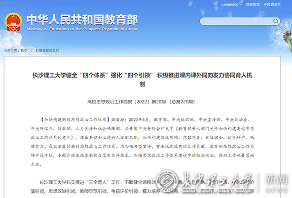 学校作为湖南省首批 “三全育人”综合改革试点高校,近年来扎实推进“三全育人”工作,打造了全省首个“三全育人”教育基地,获批43个国家级一流本科专业建设点、3门国家级和省级课程思政示范课程,获评湖南省课程思政教学研究示范中心,位列2021年全国普通高校大学生竞赛榜单(本科)第22名,两个教师团队入选“全国高校黄大年式教师团队”,涌现出了全国最美教师、中国大学生年度人物等多个师生先进典型,为高校完善育人机制、加强思想政治工作体系建设提供了有益的工作经验。