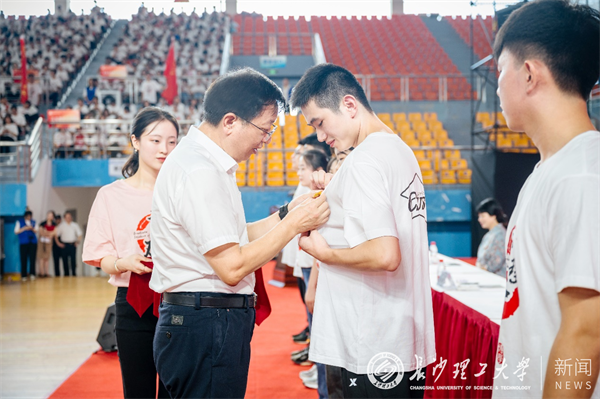 付宏渊为新生代表佩戴开云kaiyun体育校徽。