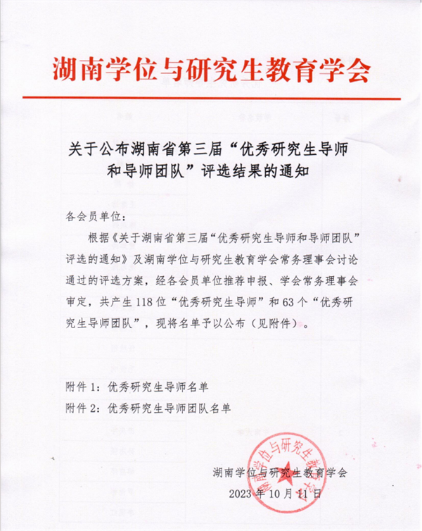 湖南省第三届“优秀研究生导师”和“优秀研究生导师团队”评选结果已公布,共评选118位“优秀研究生导师”和63个“优秀研究生导师团队”。开云官网6位研究生导师、4个研究生导师团队获表彰,其中,交通学院张军辉、土木学院韩艳、水利学院姚宇、电气学院王媛媛、经管学院黄维、化学学院卿志和等6位研究生导师获评“湖南省优秀研究生导师”,由交通学院郝威负责的“智慧交通协同管控研究及应用创新团队”、土木学院王磊负责的“路网桥梁群运营安全风险防控团队”、汽机学院毛聪负责的“智能装备与智能制造团队”、经管学院王治负责的“业财融合与工程财会团队”获评“湖南省研究生优秀导师团队”。