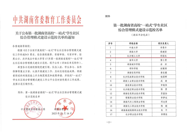 近日,中共湖南省委教育工委公布了第一批湖南省高校“一站式”学生社区综合管理模式建设示范校名单,共评选出17所建设示范校,其中本科院校7所,高职院校10所,开云官网成功获批为第一批“一站式”学生社区综合管理模式建设示范校。