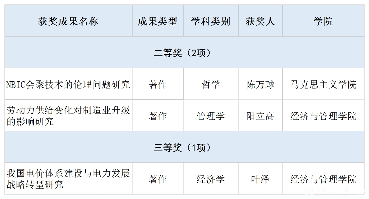 学校通过精密谋划、精心培育、精准动员、精细组织等工作模式,充分挖掘和选树高质量成果,为本次成果奖评选提供了坚实有力的支撑。此次获奖成果主要集中在哲学、管理学、经济学学科,展现出学校在相关领域深厚的学术底蕴和广泛的影响力。 获奖学院中,经济与管理学院2项成果获奖,马克思主义学院1项成果获奖。